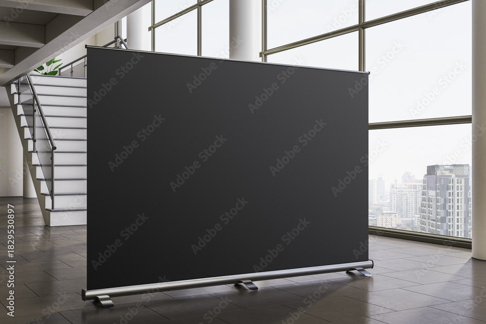 Fototapeta na wymiar - Blank black banner display in modern office hallway with city view through large windows and stairway in background. 3D Rendering.