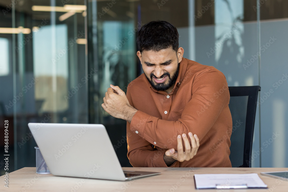 >Fototapety na wymiar>Wybrane motywy - zobacz więcej !>Woda>Young indian businessman clutching his elbow in pain while working on a laptop at his desk, suggesting repetitive strain, tendonitis or chronic discomfort from sedentary office work