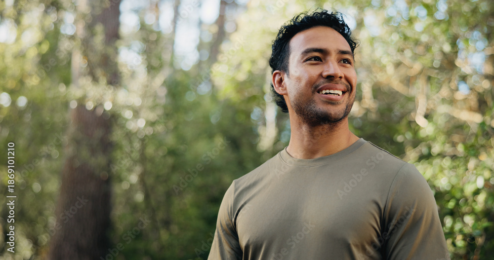 Fototapeta na wymiar - Thinking, happy or man in nature with hiking, fresh air or inspiration on trekking journey. Reflection, space or person in forest with satisfaction, mindfulness or daydreaming in outdoor adventure..