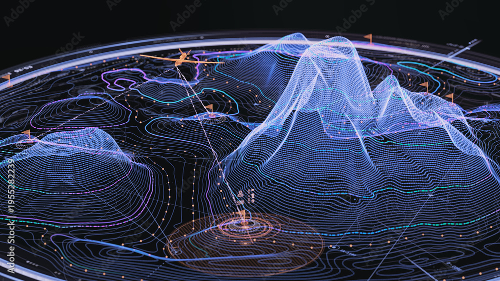 Fototapeta na wymiar - Tactical drone mission interface displaying a 3D topographic mesh with contour lines.