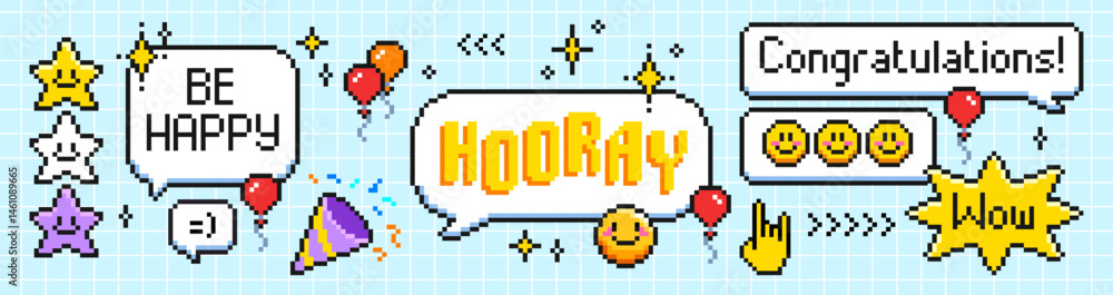 >Fototapety na wymiar>Wybrane motywy - zobacz więcej !>Wodospad>Pixel speech bubbles and icons set isolated on background. Vector illustration of messenger chat boxes with text and emoji, retro style stars, confetti, air balloon, hand signs, retro message design