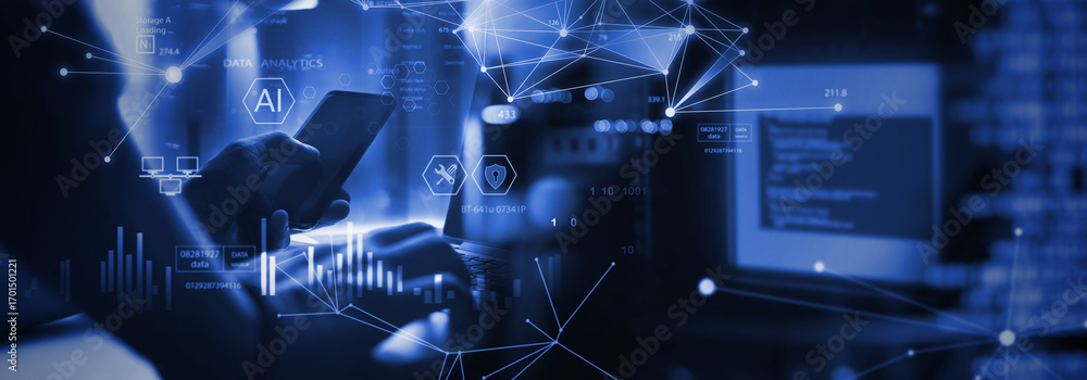 Fototapeta na wymiar - Data Science and engineering with AI, digital technology, tech background. Software engineer using AI for big data analytics, database management, cloud computing and data exchange.