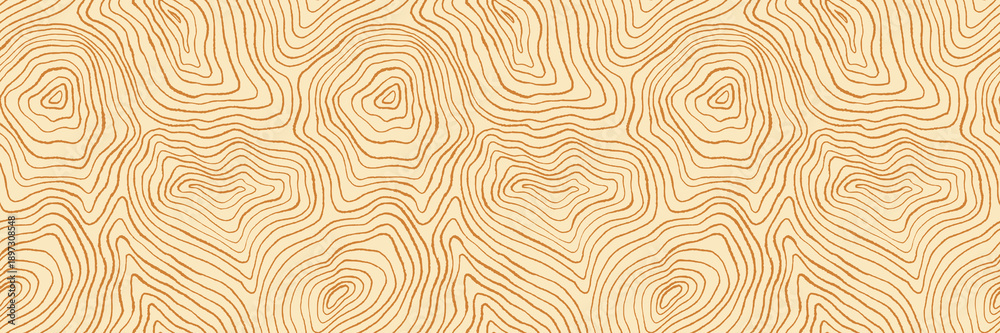 Fototapeta na wymiar - Golden abstract wooden texture seamless pattern background. Beige neutral organic banner with crayon texture wave pattern. Abstract geometric dynamical rippled surface. Doodle topographic line map..