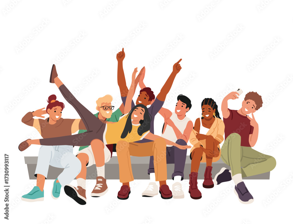 Fototapeta na wymiar - Smiling international teenage friends having fun posing for photo, making selfie sitting on bench.