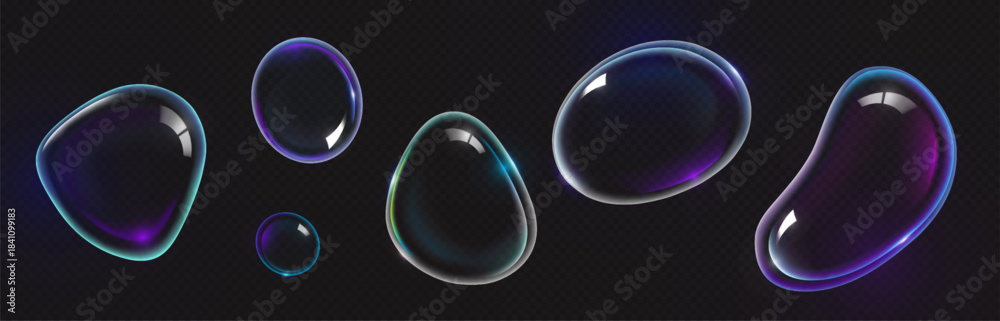 Fototapeta na wymiar - 3D soap bubbles set isolated on transparent background. Vector realistic illustration of abstract water spheres floating in air, light reflection on glossy iridescent surface, washing detergent foam.
