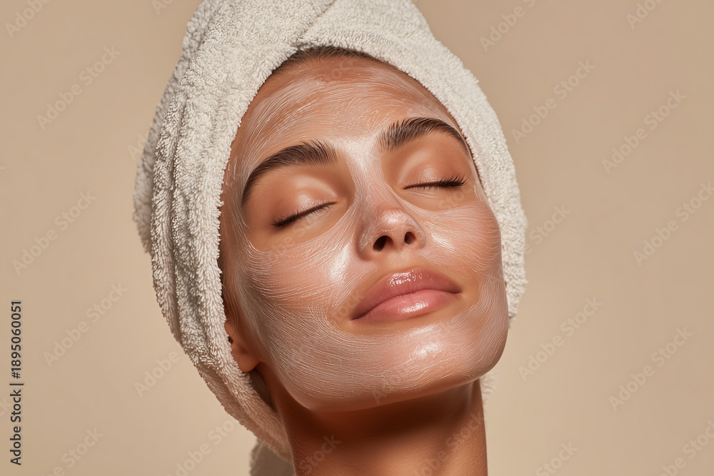 Fototapeta na wymiar - Beauty woman relaxing with facial mask treatment and towel on head, spa and wellness procedure concept. Banner with copy space..