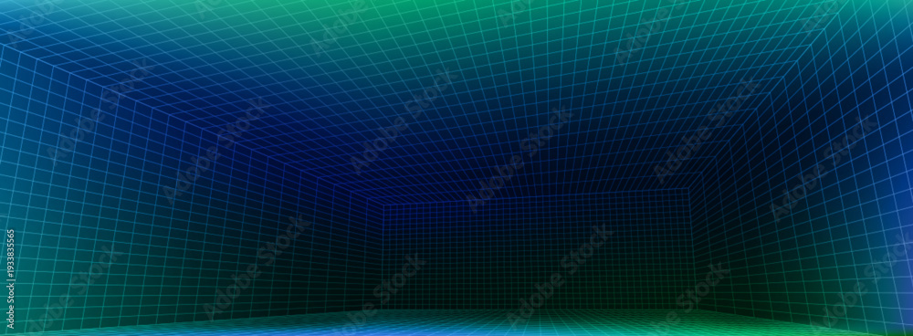 Fototapeta na wymiar - 3D wireframe grid room with perspective lines, immersive digital space for VR metaverse games. Vector background of futuristic cyber environments with neon blue green grid accents..