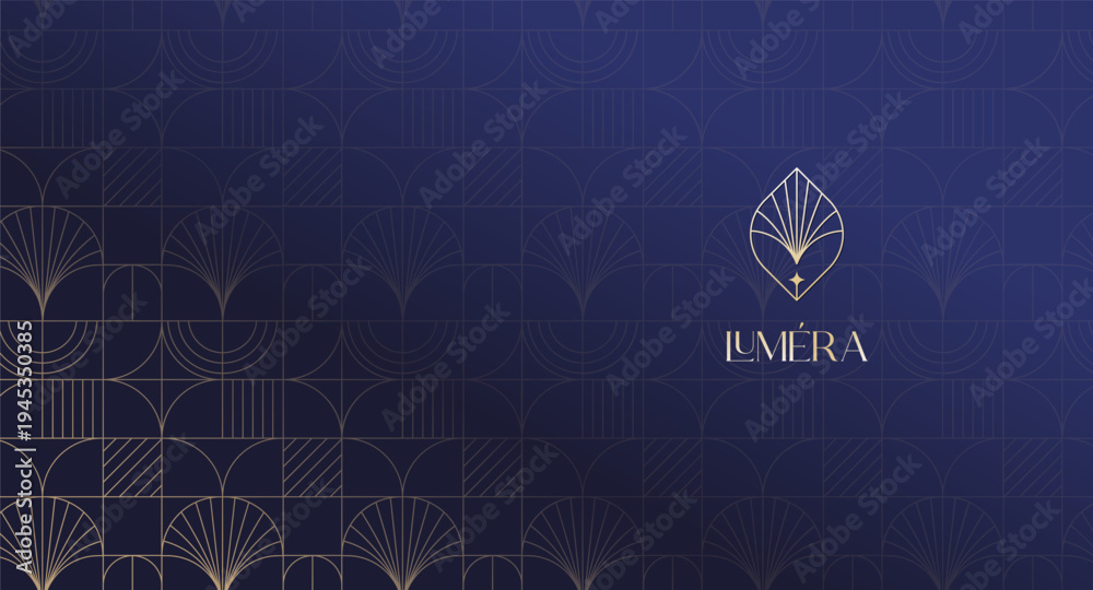 Fototapeta na wymiar - Vintage Art Deco luxury dark blue background with gold line art seamless pattern. Golden geometric template design..