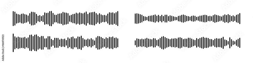 Fototapeta na wymiar - Black podcast sound wave patterns with varying amplitude bars for audio visualization and media interfaces. Digital frequency lines on white bg for music players, recording apps or broadcast design..