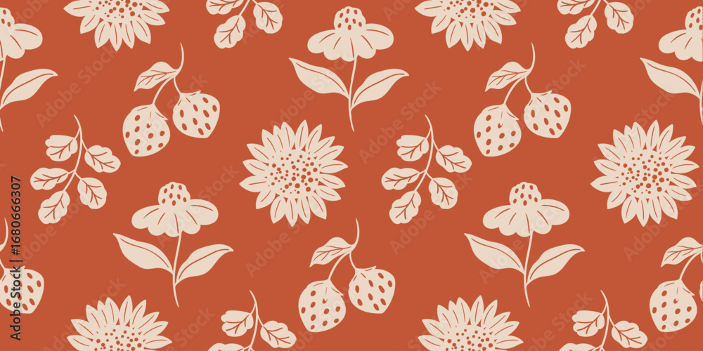 >Fototapety na wymiar>Wybrane motywy - zobacz więcej !>Zebra>Autumn season seamless pattern background vector. Fall harvest wallpaper with strawberry, sunflower, leaves. Design for print, cover, fabric, packaging, wall art, home decor.