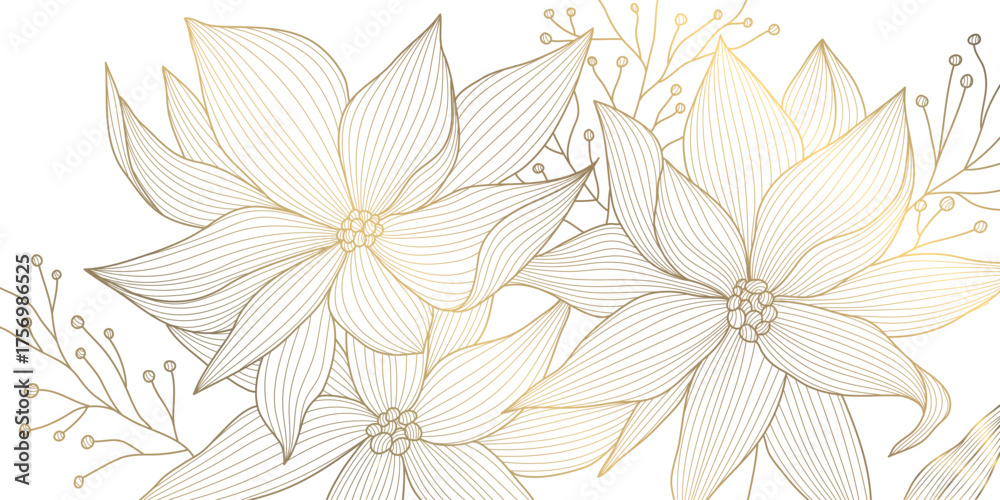 Fototapeta na wymiar - Elegant golden floral background with seasonal botanical elements, line vector style. Perfect for luxury holiday cards, wedding invitations, and modern winter or spring design projects.