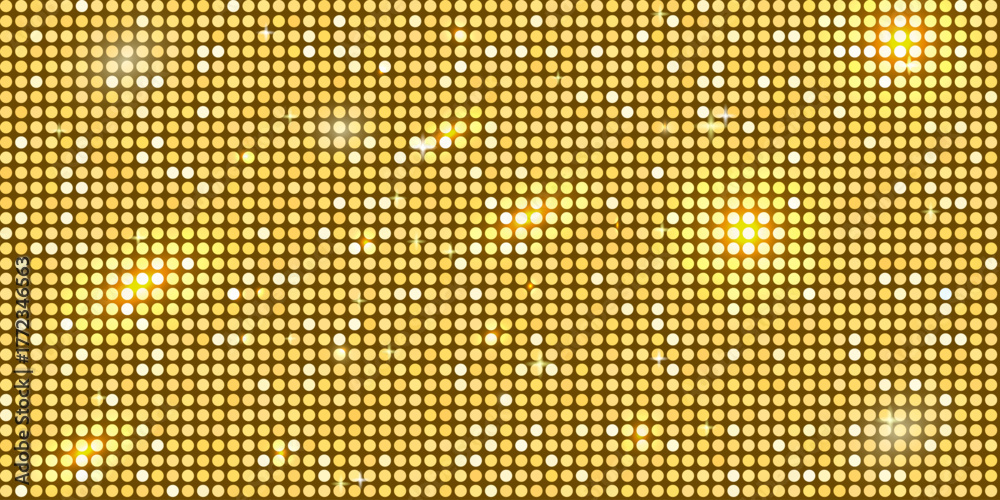 >Fototapety na wymiar>Wybrane motywy - zobacz więcej !>Zebra>Golden disco ball inspired glitter mosaic pattern with sequin shine and sparkle texture. Circles halftone backdrop. Yellow party background with mirror light decoration. Vector illustration.