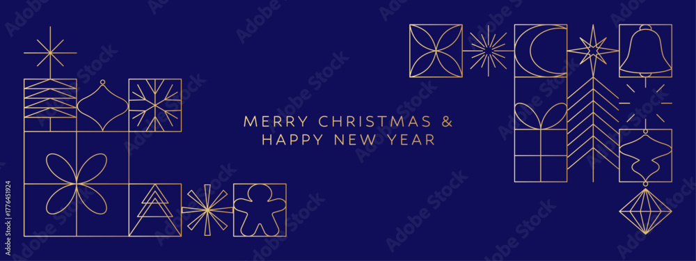 Fototapeta na wymiar - Christmas banner, gold holidays frame, geometric decorations.