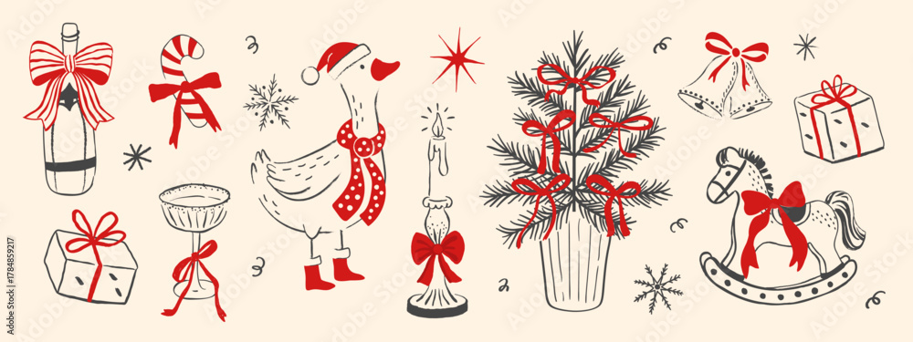 Fototapeta na wymiar - Set of festive winter holiday elements in hand-drawn sketch style, featuring a champagne bottle, gift box, bells, candy cane, goose, candle, Christmas tree, and rocking horse, for greeting card and.