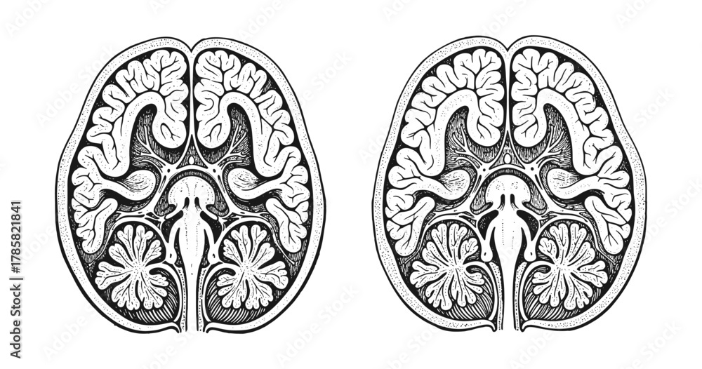 Fototapeta na wymiar - Detailed engraving of human brain anatomy cross-section.