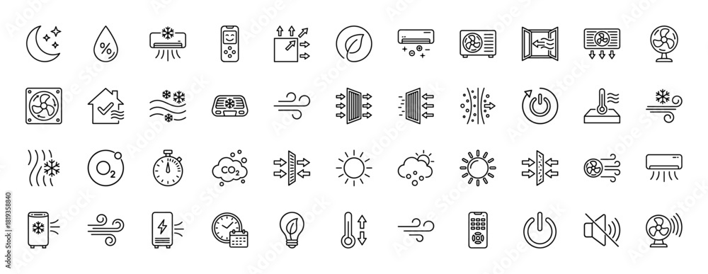 Fototapeta na wymiar - HVAC and climate control line icon set. Vector pictograms of air conditioners, fans, filters, temperature, humidity sensors, and smart home elements, thin linear illustration..