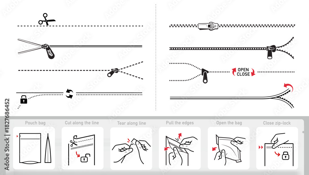 >Fototapety na wymiar>Wybrane motywy - zobacz więcej !>Zebra>A set of icons for opening zip locks, tear notch on packaging. Zip and scissors vector icon set. Each icon perfect for your food bags, clothes vacuum bags, handbags, slider bags, ziplock bag. EPS10.
