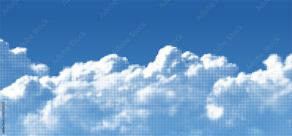 Fototapeta na wymiar - Halftone Dot Cloud on Blue Gradient Sky. Vector Retro Pop Art Pattern. Abstract White Half Tone Effect Clouds. Summer Sky Manga Book Anime Background..