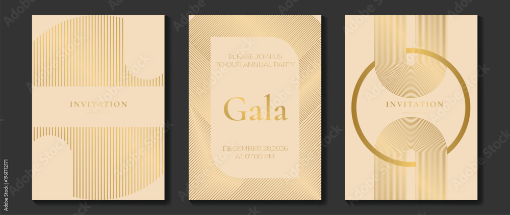 Fototapeta na wymiar - Luxury gala invitation card background vector. Golden elegant wavy gold line pattern on black background. Premium design illustration for wedding and vip cover template, grand opening..