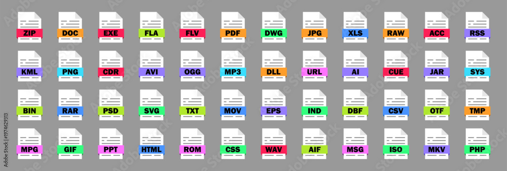 Fototapeta na wymiar - Colorful File Format Icons Set – Digital Document Extension Symbols Vector.