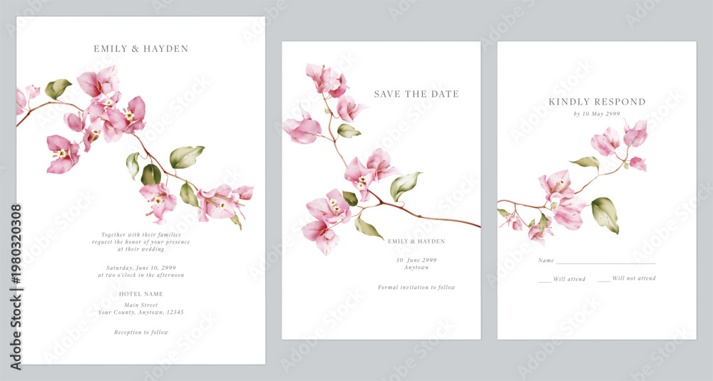 Fototapeta na wymiar - Wedding invitation suite featuring watercolor-style pink Bougainvillea flowers on a clean white background.