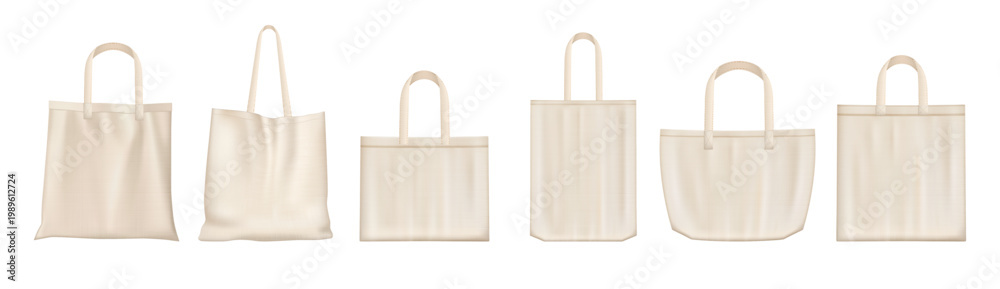 >Fototapety na wymiar>Wybrane motywy - zobacz więcej !>Zebra>Tote bags mockups in various shapes and handle lengths. Vector realistic set of cloth canvas eco shoppers. Blank fabric cotton or linen reusable grocery handbags, custom designs ecobags