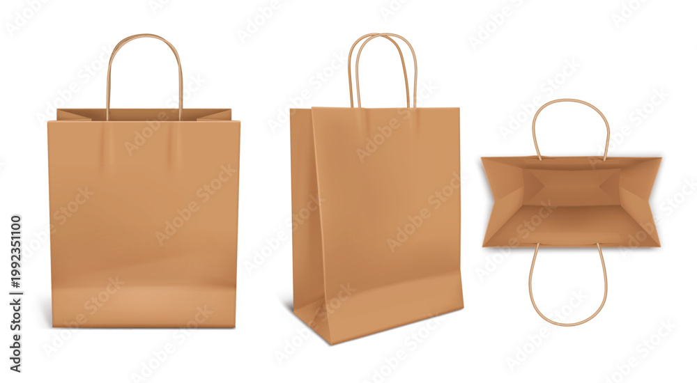 Fototapeta na wymiar - Kraft paper shopping bag mockup with handles, realistic 3D brown retail package in front, side and top views, empty eco friendly paper pack vector template isolated.