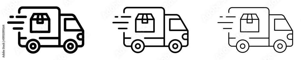 >Fototapety na wymiar>Wybrane motywy - zobacz więcej !>Zebra>Set of linear fast delivery truck icons with a parcel inside with different stroke weights. Minimalist symbols of logistics, postal services, and transportation. Vector illustration.