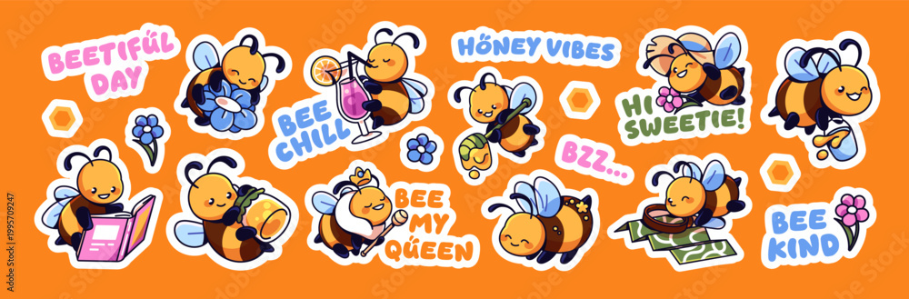 >Fototapety na wymiar>Wybrane motywy - zobacz więcej !>Zebra>Set of cute bees. Sticker pack of funny honeybees with comic phrases. Happy bumblebees holding and eating honey, with flowers, reading books, drinking and flying. Flat isolated vector illustrations