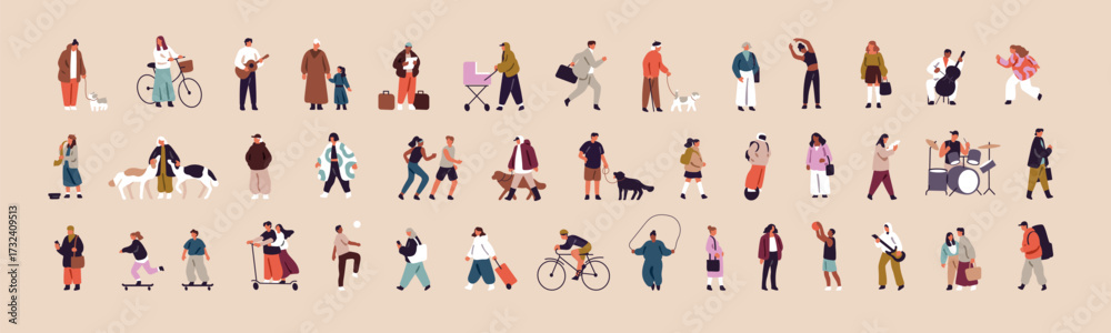 Fototapeta na wymiar - Set of tiny people walking outdoors. Children are skateboarding, characters go with their dogs on street. Men and women ride bikes, play music, have fun in city. Flat isolated vector illustrations..