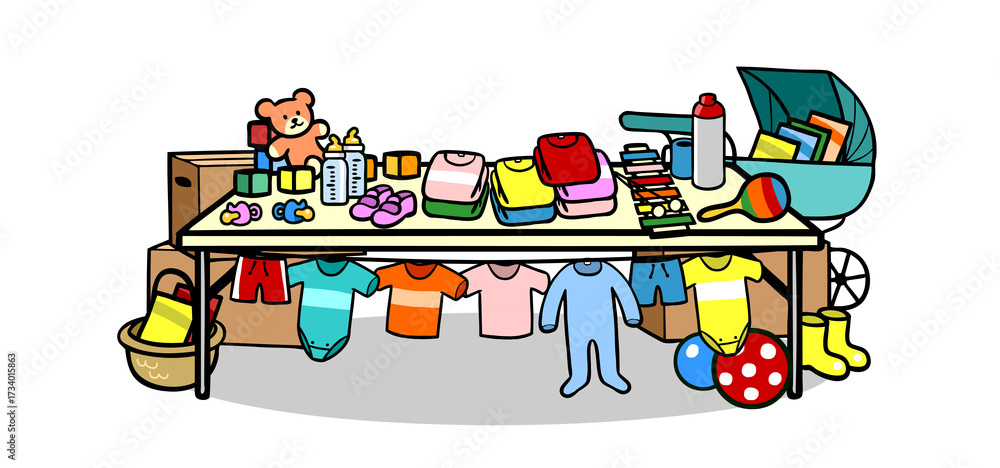Fototapeta na wymiar - Voller Tisch mit gebrauchten Kindersachen als Stand für Kinderflohmarkt.