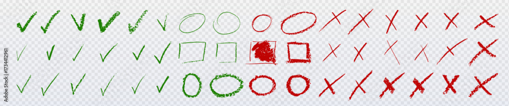 Fototapeta na wymiar - Green and red vote check doodle marks with circles, squares for correct or incorrect answers - crayon texture symbols on transparent background. Educational materials for tests and to do lists..