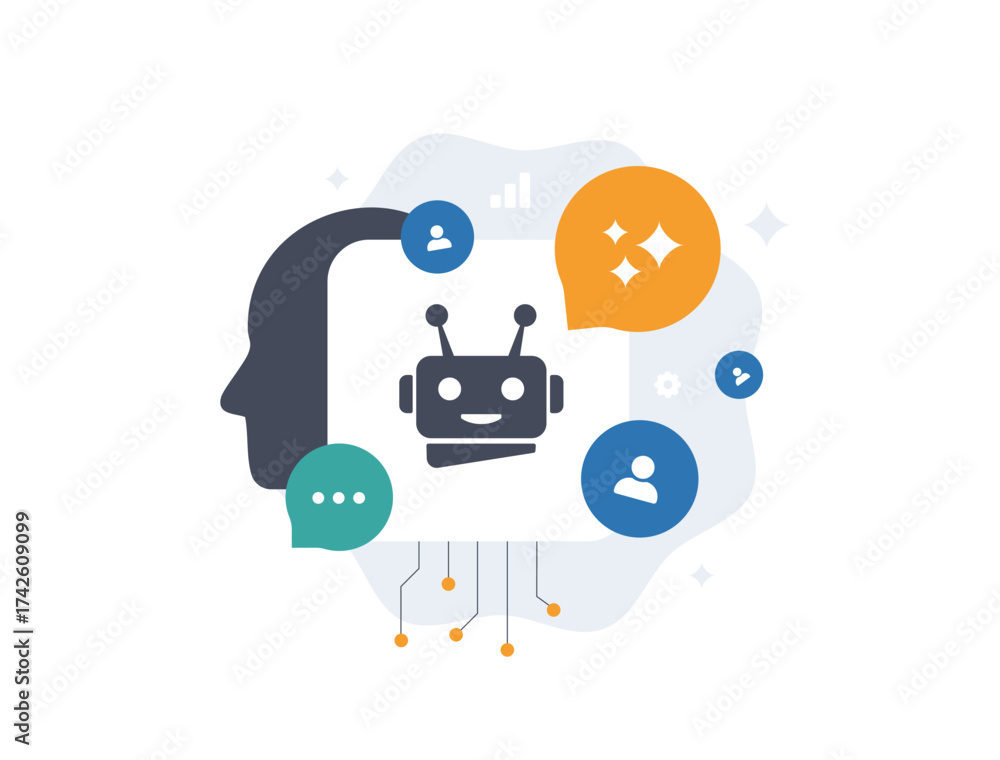 Fototapeta na wymiar - Agentic AI personalization vector illustration. Autonomous bots crafting customer journeys with data streams and adaptive interfaces for hyper-targeted ai marketing campaigns and digital strategies.