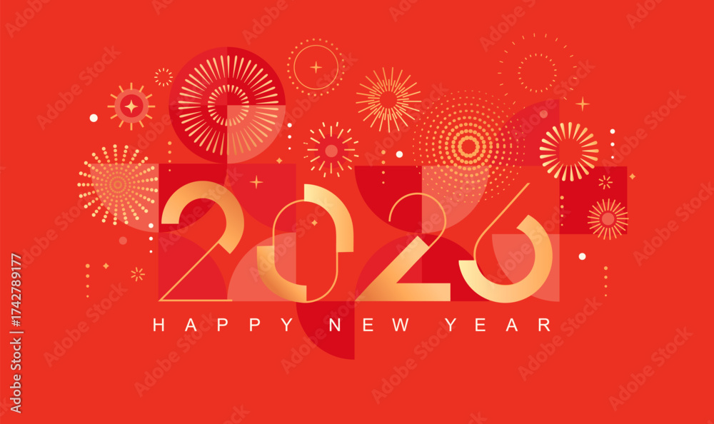 Fototapeta na wymiar - Celebrating 2026 New Year. Bright card for happy event with abstract golden fireworks and golden numbers on red background with geometric pattern. Template for poster, flyer, web. Vector illustration.