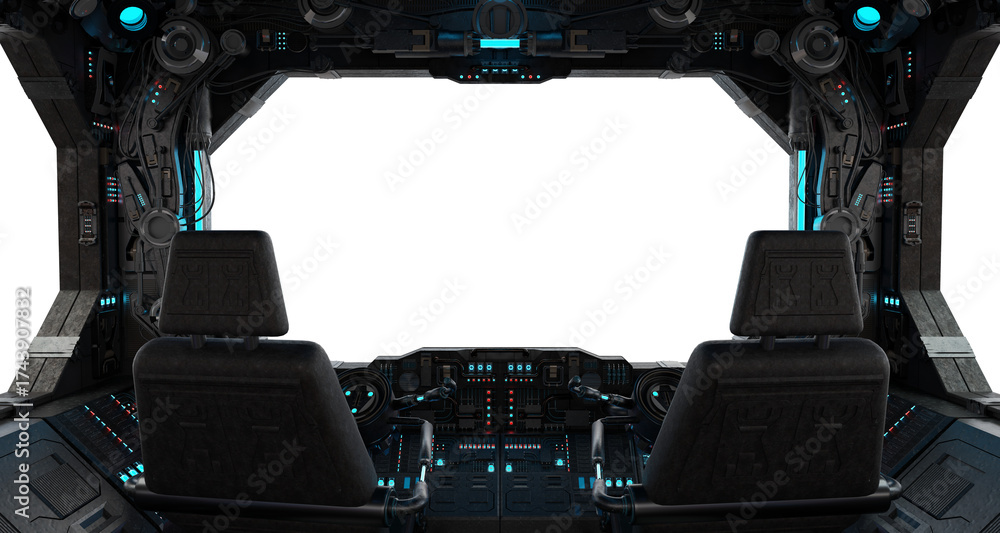 Fototapeta na wymiar - Grunge dark spaceship cockpit with isolated cut out transparent window. Futuristic black starship interior with glowing lights. 3D rendering.
