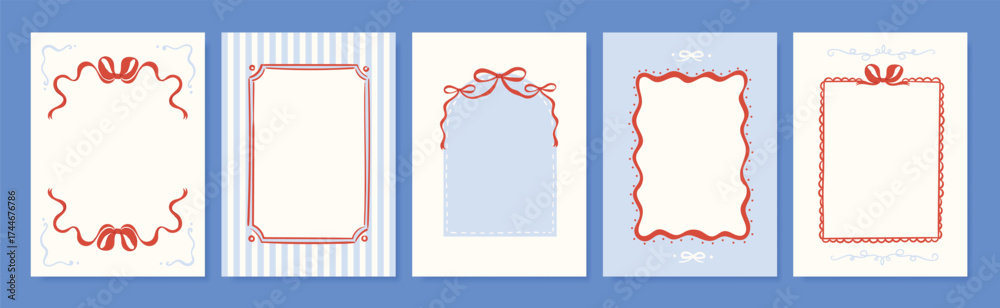 Fototapeta na wymiar - Vintage hand drawn frames vector set. Collection frame template in different shape with ribbon decorative. Design for card, poster, cover, background..