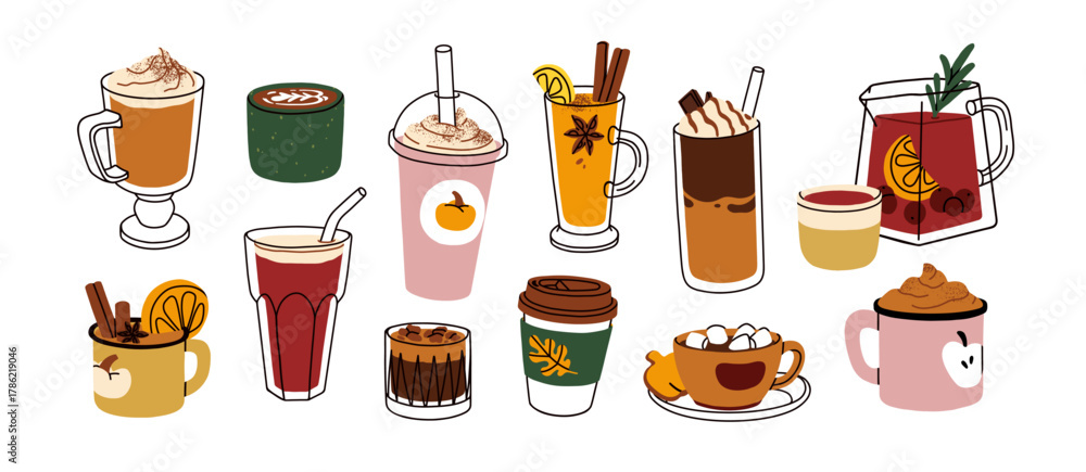 >Fototapety na wymiar>Wybrane motywy - zobacz więcej !>Zielony>Autumn drinks set. Hot pumpkin latte, tea and coffee with spices, cocoa with marshmallow. Seasonal fall and winter beverages in cup, mug, glass. Flat vector illustrations isolated on white background.