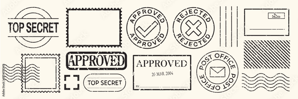 Fototapeta na wymiar - Collection of postal stamps with 'approved', 'rejected', and 'top secret' labels. Includes post office and envelope designs. Vintage stamp style. Black stamps, vector set..