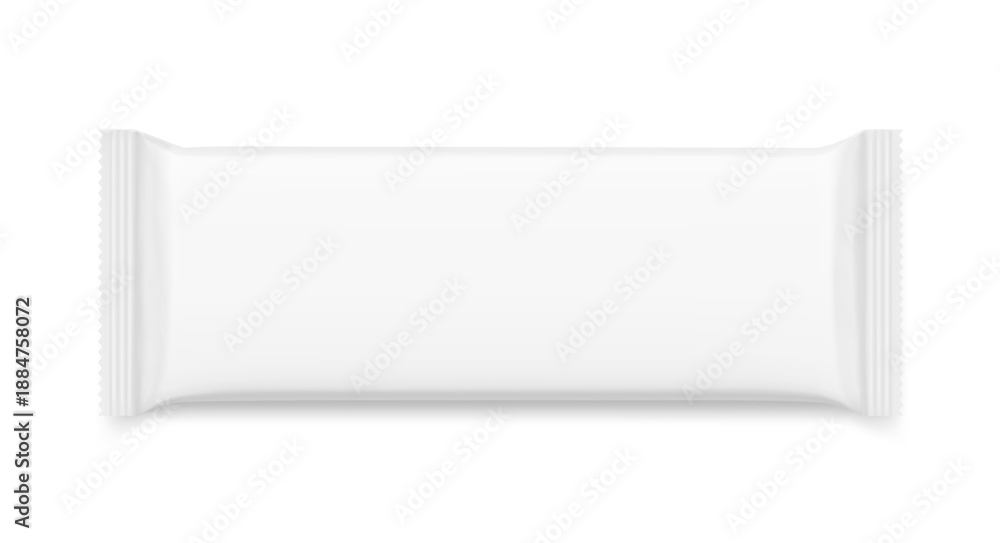 Fototapeta na wymiar - Realistic flow packaging mockup for bars, candies, waffles. Front side. Vector illustration on white background. Easy to use for presentation your product, idea, design. EPS10..