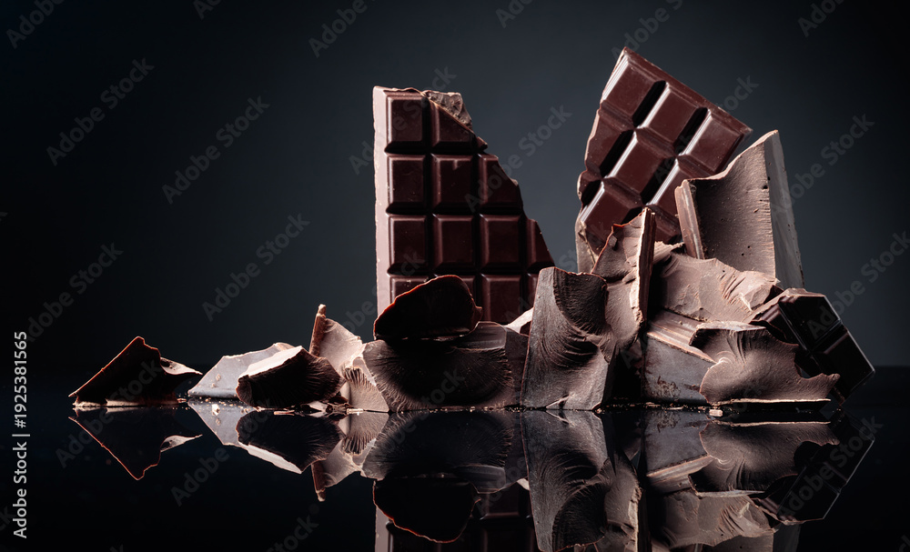 Fototapeta na wymiar - A broken chocolate bar and pieces of dark chocolate on a black reflective background..