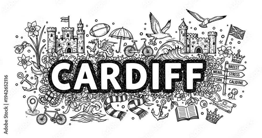 Fototapeta na wymiar - Cardiff doodle art: castles, seagulls, rugby, and welsh symbols in intricate black and white.