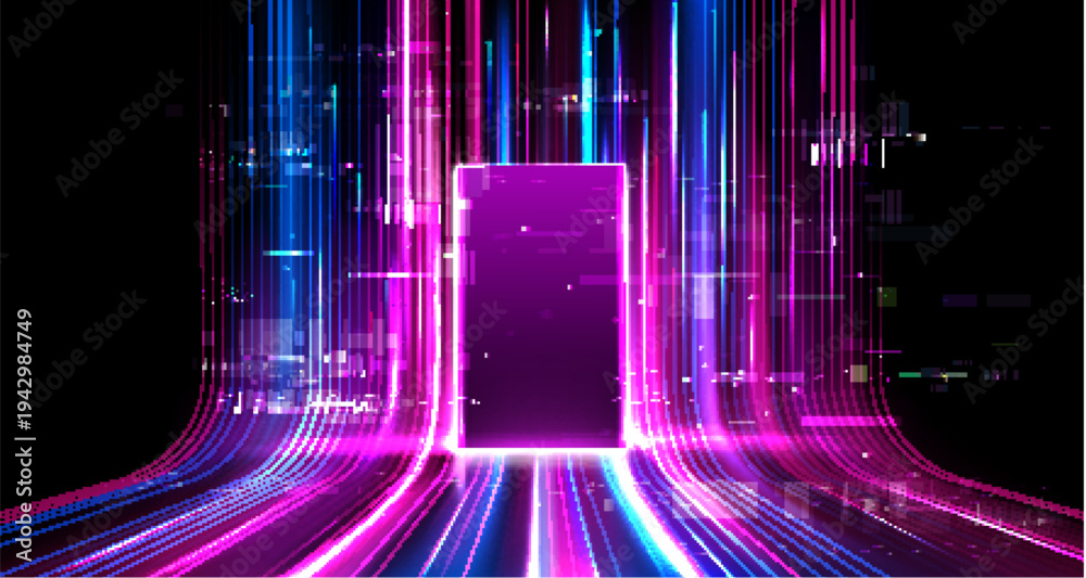 Fototapeta na wymiar - Futuristic digital open door or portal, glowing neon cyberspace. Abstract vector background with dynamic data streams and glich effect, 3d tech gate entrance illuminated by blue purple light.