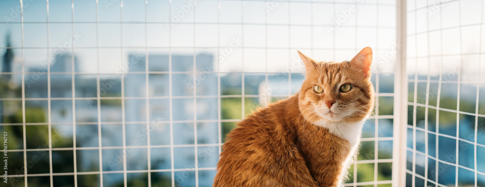 Fototapeta na wymiar - A contented cat is sitting on a window with a safety net..