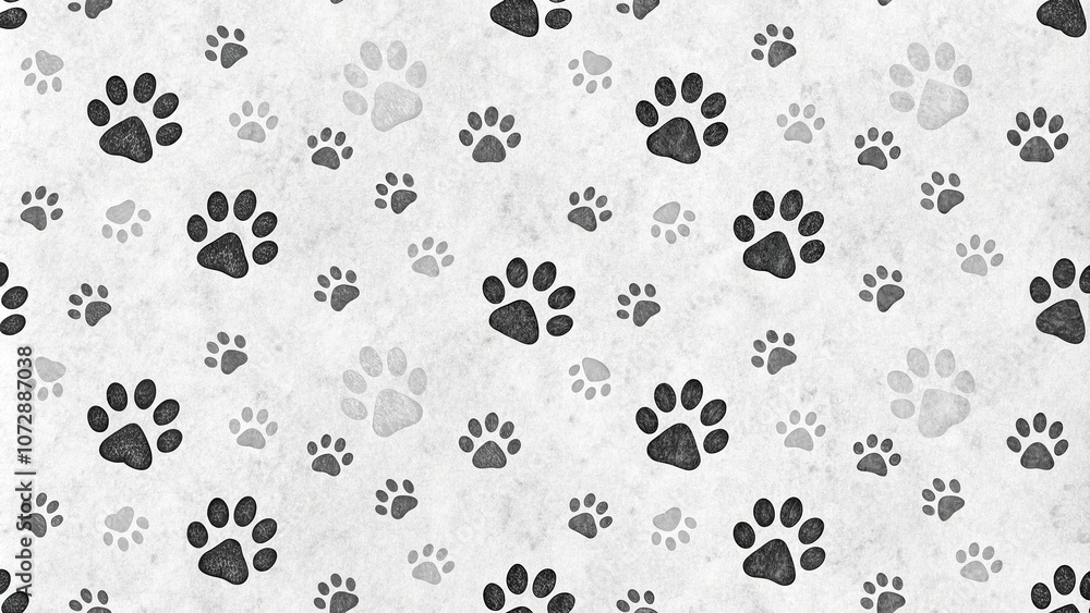 Fototapeta na wymiar - Seamless black doodle paw prints pattern background with a subtle texture and gentle lines for a pet lover's home decor, pet friendly, black and white, geometric patterns.