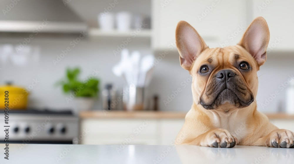 Fototapeta na wymiar - A focused French Bulldog stands alert on a sleek kitchen countertop, embodying the perfect blend of charm and attentiveness in a serene, minimalistic kitchen setting..