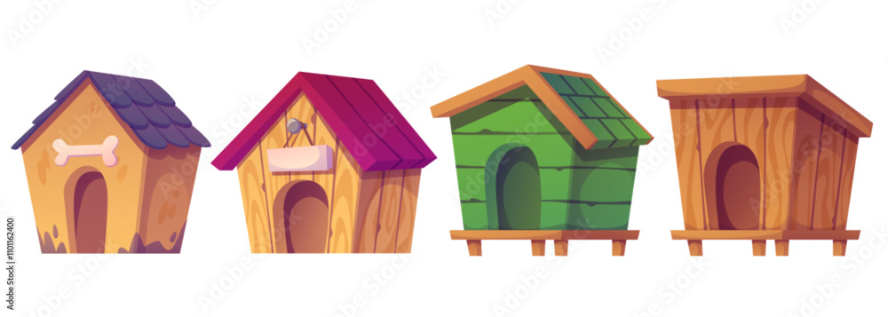 Fototapeta na wymiar - Cartoon wooden dog kennels of different designs and rooftops. Wood structures with arched entrances and decorative elements for comfortable pets shelter. Cute shelters for canine companions..