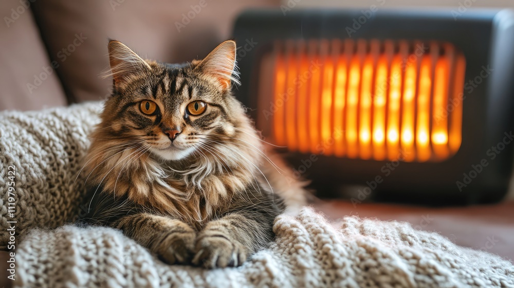 Fototapeta na wymiar - Fluffy brown tabby cat resting on a cozy knitted blanket in front of an electric heater, warm home atmosphere, indoor comfort, pet portrait, relaxation, cute animals..