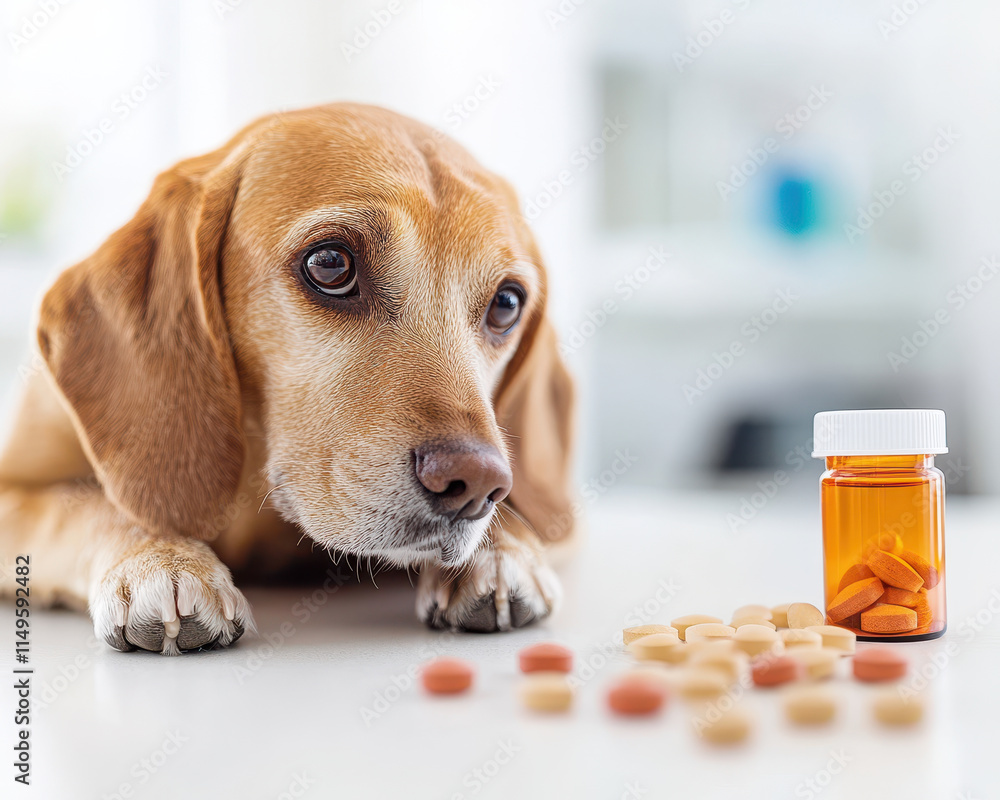 Fototapeta na wymiar - dog looking curiously at pet medications and vitamins on table.