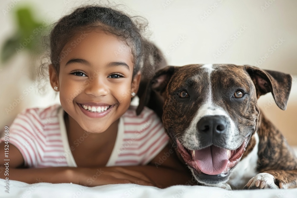 Fototapeta na wymiar - Girl smiling with her dog at home, showcasing a joyful friendship and special bond between pets and children.