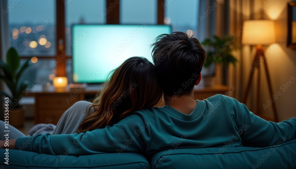 Fototapeta na wymiar - Couple cuddles on sofa watching TV in cozy living room. City view from windows shows relaxed evening together. Intimate moments of comfort and love. Romantic home scene..